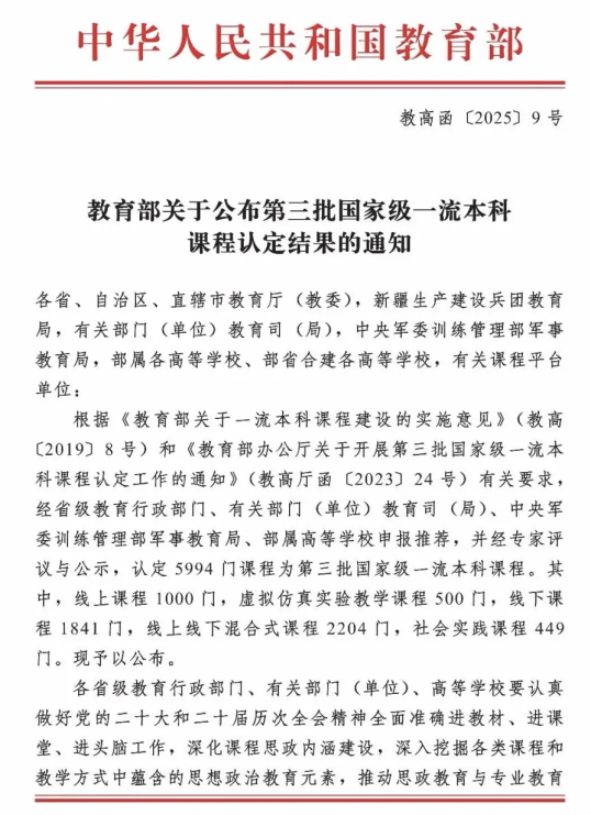 近日,教育部印发《关于公布第三批国家级一流本科课程认定结果的通知》(教高函〔2025〕9号),正式公布第三批国家级一流本科课程名单。欧美无码