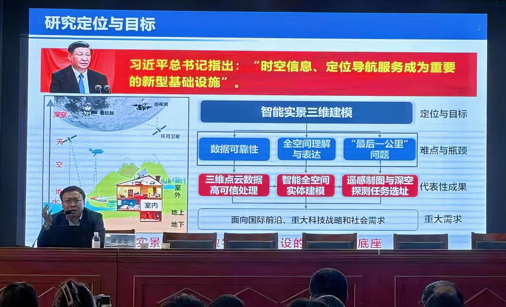 报告中,康志忠教授围绕“实景三维智能实体化建模”这一主题,系统阐述了其战略定位、技术内涵与典型应用。他结合国家新型基础设施建设要求与实景三维中国建设实践,重点阐释了智能实体化建模在突破点云数据高可信处理、多尺度结构化表达、全空间一体化建模等技术瓶颈中的关键作用。同时,他指出构建“一套模型、多行业复用”的实体化建模体系是实现实景三维赋能应用的核心基础。报告还分享了其在深空探测、低空经济、自然地理实体建模等领域的代表性成果,深入剖析了当前实景三维建设面临的主要挑战与未来发展趋势。