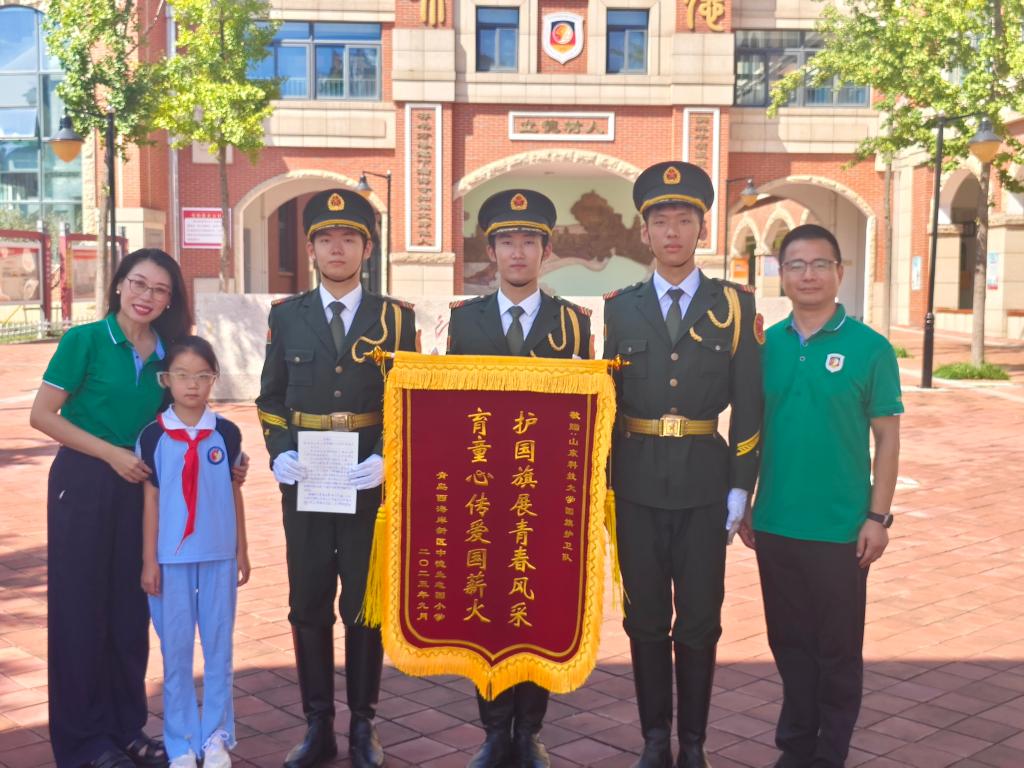 仪式过后,现场展开温馨互动。学生代表向国旗护卫队献上精心手写的感谢信,字字句句满载崇高敬意;中德生态园小学教师代表学校向三位升旗手赠送锦旗,表达诚挚谢意。