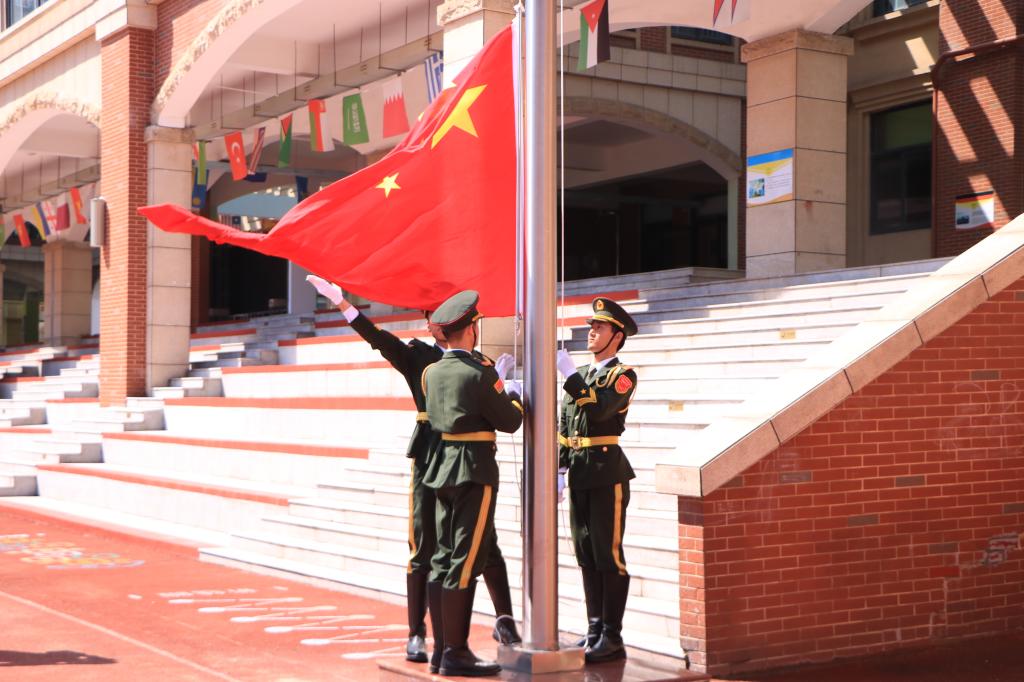 上午10时,指令声响,三位升旗手身着笔挺礼服,迈着铿锵有力的正步护卫国旗走向旗台。伴随《义勇军进行曲》激昂奏响,升旗手振臂扬旗,五星红旗迎风冉冉升起。全体同学庄严肃立,炽热目光追随国旗缓缓上升,以真挚情意表达对祖国母亲的深沉热爱。