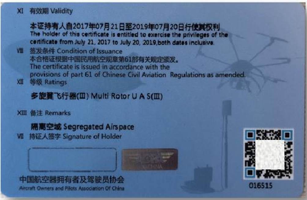 我校学员经理论和实践考试合格后,可以获得三个证书,分别是由中国民用航空局颁发的民航局“无人机驾驶员云执照”,由中国航空器拥有者及驾驶员协会(AOPA)颁发的“AOPA无人机驾驶员合格证”,和由欧美无码 颁发的欧美无码 无人机测绘结业证书。其中民航无人机驾驶员执照和AOPA无人机驾驶员合格证等级高,含金量大,“一考双证”是我们睿飞无人机培训学校的巨大优势。